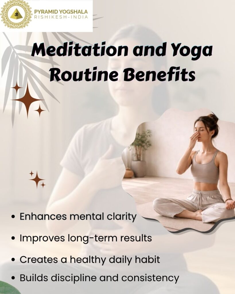 The meditation and yoga routine benefits include better consistency, improved focus, and overall well-being. Over time, it keeps your mind calm, body active, and lifestyle more balanced.